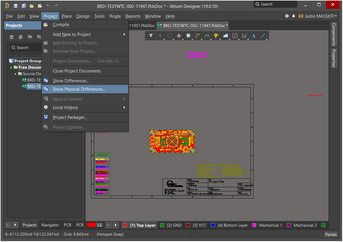 First, you need to open the two files. Then you go in the “Project” menu, items “Show (logical) Differences” or “Show Physical Differences”.